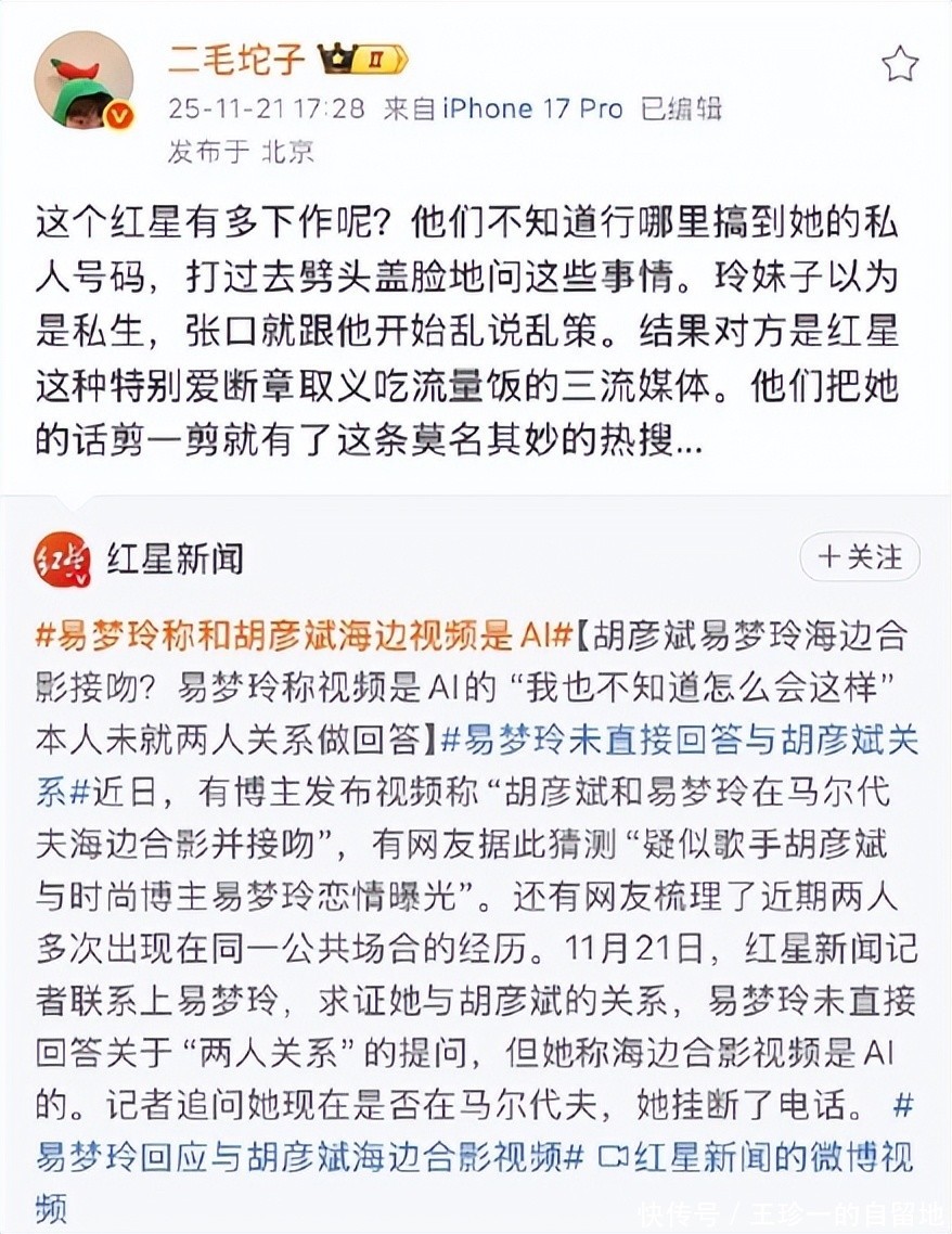 “二毛坨子”说红星新闻不知道怎么弄到了易梦玲的电话,电话打过去就劈头盖脸的询问,易梦玲以为是私生,就随便胡说八道应付了一下,结果红星新闻把易梦玲的话剪了一下,就有了易梦玲说海边视频是AI的热搜。