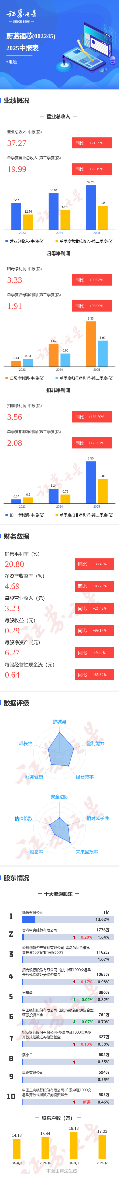 证券之星音信,湛蓝锂芯2025年中报裸露,公司主营收入37.27亿元,同比飞腾21.59%;归母净利润3.33亿元,同比飞腾99.09%;扣非净利润3.56亿元,同比飞腾186.51%;其中2025年第二季度,公司单季度主营收入19.99亿元,同比飞腾22.2%;单季度归母净利润1.91亿元,同比飞腾98.0%;单季度扣非净利润2.08亿元,同比飞腾175.01%;欠债率34.58%,投资收益14.77万元,财务用度1166.68万元,毛利率20.8%。